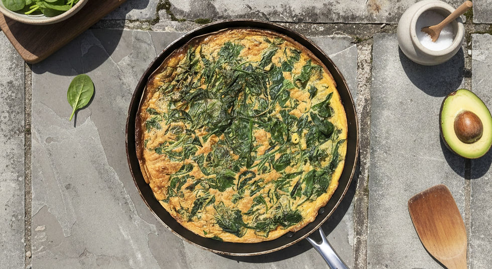 Heat 1-2tbsp of oil in a large frying pan (around 28cm) distribute the sweet potato, onion and pepper mix evenly before spreading out the spinach on top. Pour egg mixture over, pressing down any vegetables that may be sticking out. Cook on medium heat for around 8 minutes or until the eggs start to colour around the edges.